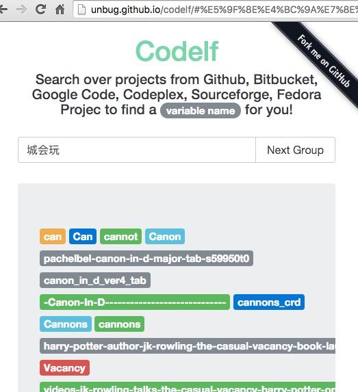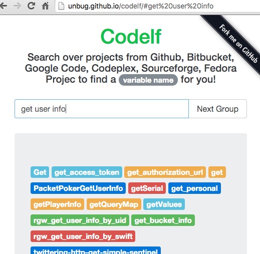 Codelf通過搜索在線開源平臺Github, Bitbucket, Google Code, Codeplex, Sourceforge, Fedora Projec的項目源碼,幫開發(fā)者從中找出已有的匹配關鍵字的變量名。這個搜索服務支持直接搜索中文。codeif支持中文查詢,輸入中文意思,codeif可以根據需要查詢盡可能滿足需要的結果,并展示與查詢結果相關的支持各種編程語言的代碼片段以及代碼庫。